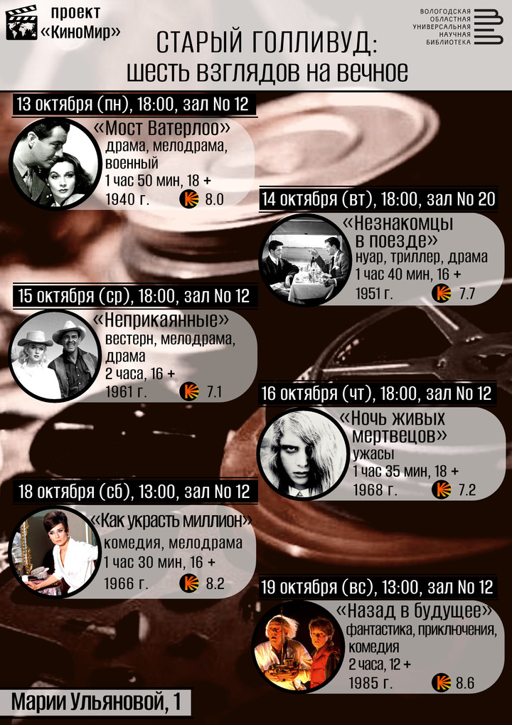 Вологодская областная библиотека имени Бабушкина продолжает реализацию проекта «КиноМир». С 13 по 19 октября вологжан приглашают посмотреть фильмы «Золотого Голливуда» в рамках программы «Старый Голливуд: шесть взглядов в вечное».