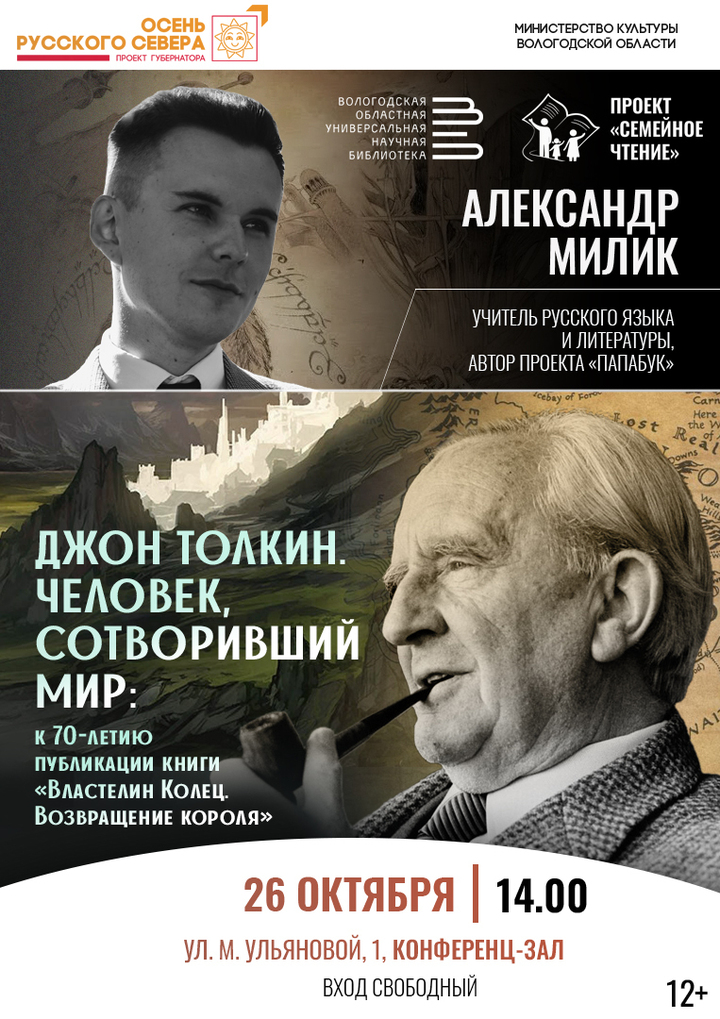В Вологодской областной библиотеке близится очередная лекция просветительского проекта «Семейное чтение». 26 октября всех желающих приглашают обсудить вселенную знаменитого писателя Джона Рональда Руэла Толкина. Спикером выступит учитель русского языка и литературы, автор проекта «ПАПАБУК» Александр Милик.