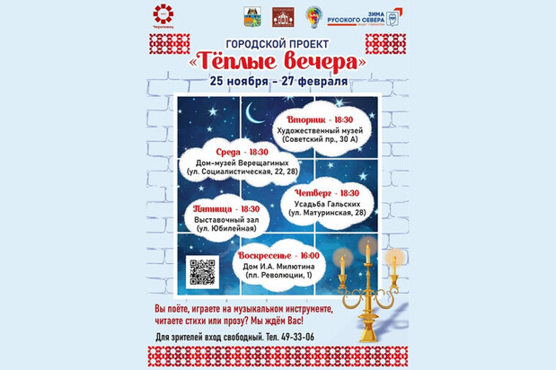 Этой зимой в Череповце продолжится реализация проекта «Голос города». С 25 ноября по 27 февраля пять раз в неделю для жителей будут проводиться «Теплые вечера». Для зрителей вход свободный.