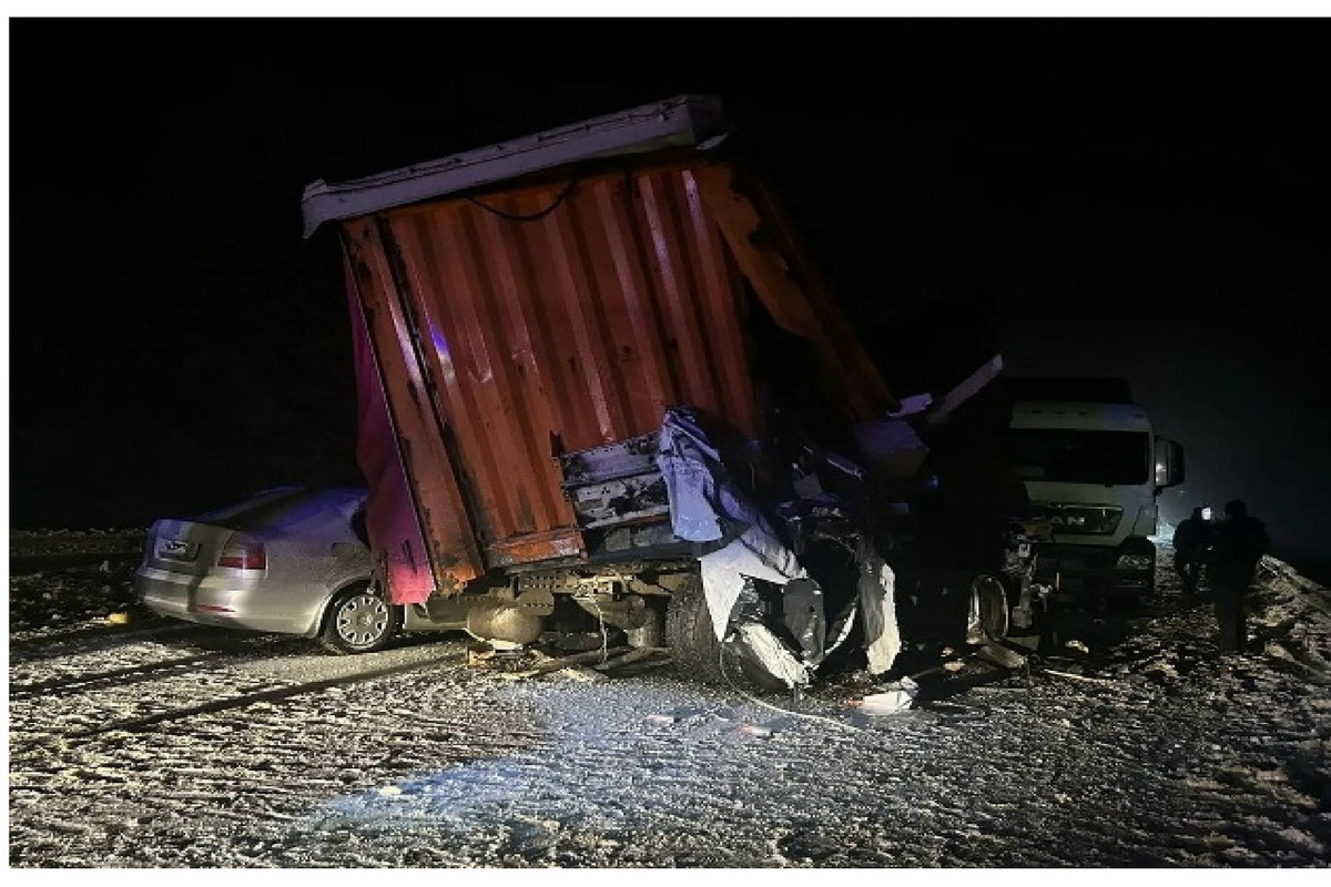 В ДТП попали КАМАЗ с полуприцепом, грузовой «Рено Магнум» с полуприцепом, «Ман» с полуприцепом и автомобиль «Шкода октавия». На данный момент известно о двух погибших: водитель КАМАЗа и пассажир «Рено Магнум» 1991 года рождения. Еще три человека получили травмы. Подробности ДТП уточняются.