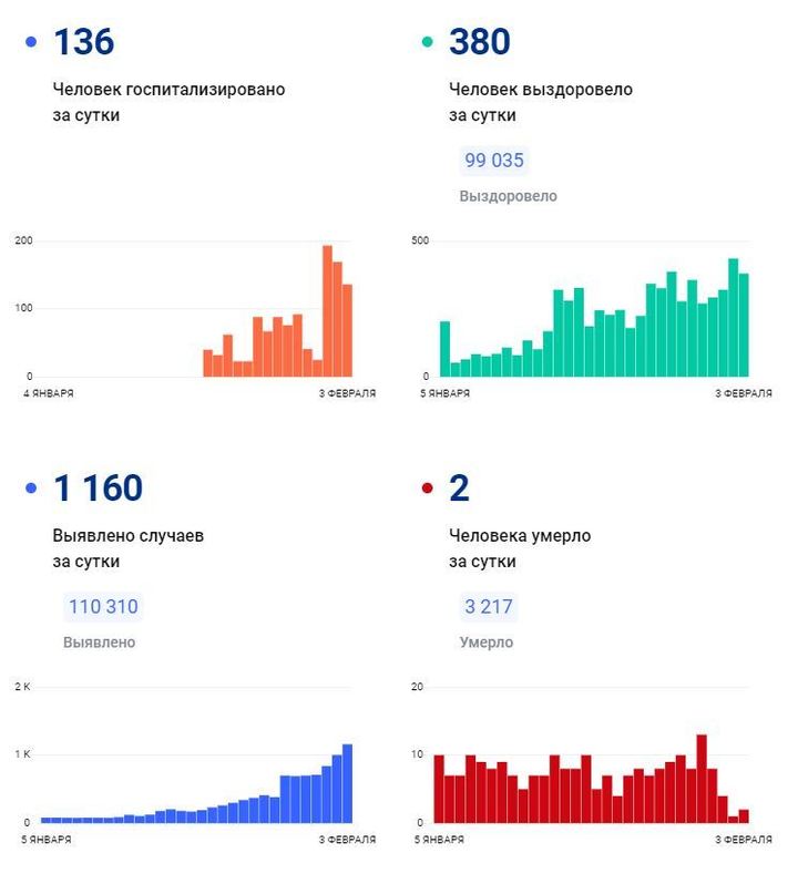 По данным на 3 февраля, в Вологодской области выявлено 1160 новых случаев заражения COVID-19, что увеличило общее число инфицированных за всю пандемию до 110 310. За минувшие сутки госпитализировано 136 человек. Ежедневную статистику предоставляет официальный портал стопкоронавирус.рф.