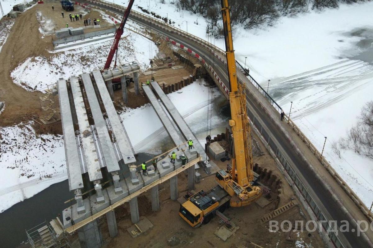 Ход ремонтных работ на мосту в поселке Кувшиново через реку Вологду проинспектировал мэр города Сергей Воропанов. На данный момент установлено пять балок длинной 33 метра. Всего необходимо установить таких восемь штук.