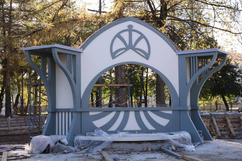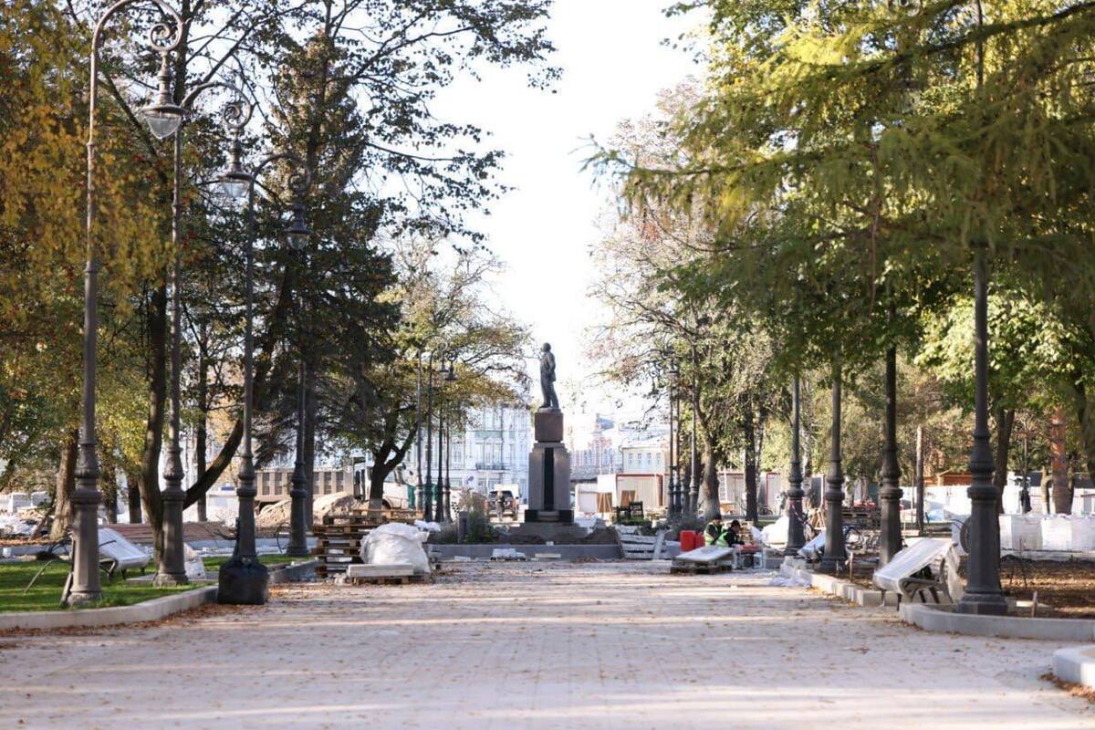 Специалисты установили западные опоры освещения, проложили кабели видеонаблюдения. Специалисты устанавливают бордюры, укладывают брусчатку, собирают и монтируют объекты. Продолжается обустройство детской площадки, санузла, фонтана. Ведется озеленение. Также здесь появится чайный домик и кукольный театр.