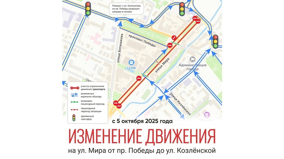 При проезде улицы Козленской через Мяснорядский мост можно будет повернуть направо на четную сторону улицы Мира, далее проехать на нечетную сторону проспекта Победы. Разрешат правый поворот с улицы Батюшкова на проспект Победы. Такой временный маршрут позволит сократить пробки на улице Пушкинской. В дальнейшем будут вноситься изменения, исходя из проводимых ремонтных работ.