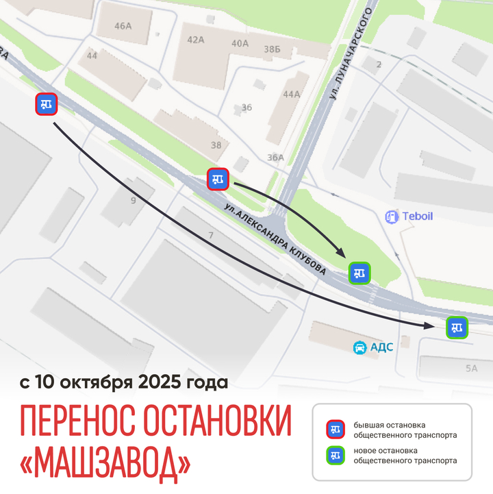 Остановку «Машзавод» перенесут с 10 октября. Пассажиры пригородных маршрутов №№ 403, 405, 406, 408, 412 станут пользоваться остановочным пунктом рядом с АЗС. Две остановки объединили в одну для удобства.