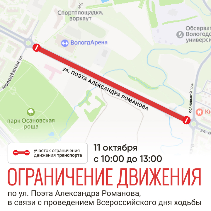 Всероссийский день ходьбы, приуроченный к 80-ой годовщине Великой Победы, состоится в областной столице 11 октября. Мероприятия запланированы с 10.00 до 13.00. Для транспорта в связи с этим закроют улицу Поэта Романова.