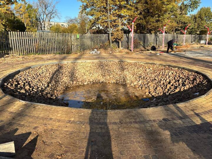 На данный момент специалисты обустроили спортивную площадку, зону воркаута. На детской площадке уложено резиновое покрытие и ведется монтаж оборудования. Установлена чаша для искусственного пруда. Вокруг него и на событийной площадке уложена брусчатка. Рабочие выкладывают центральные дорожки. Установлены беседки и опоры освещения.