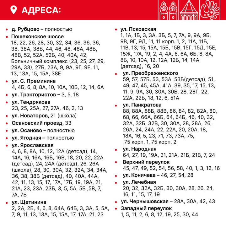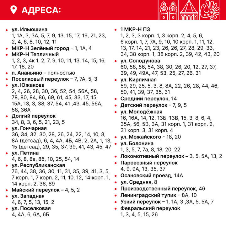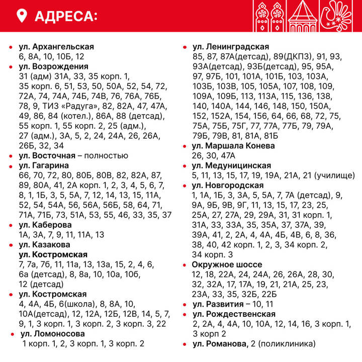 В карточках представлен обновленный список адресов, попадающих под отключение.