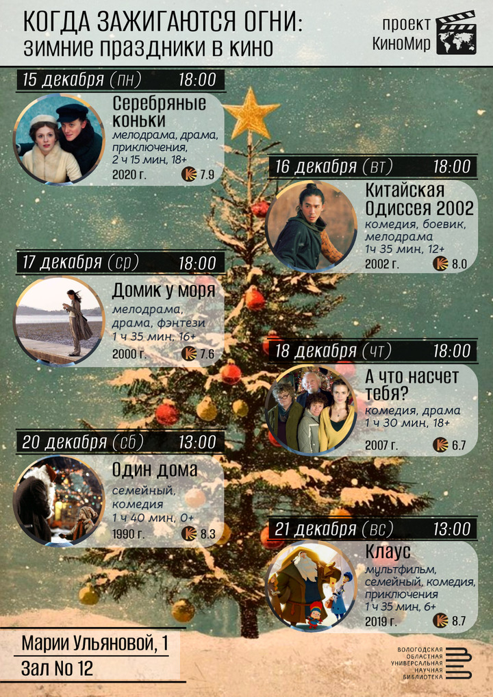 Заключительная в этом году неделя киносеансов в Вологодской областной библиотеке будет посвящена новогодним фильмам. Проект «КиноМир» с программой «Когда зажигаются огни: зимние праздники в кино» ждет вологжан с 15 по 21 декабря.