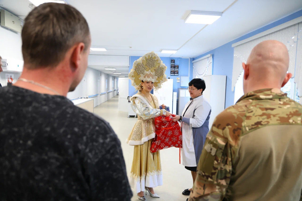 Помощница Деда Мороза вместе с волонтерами поздравила с наступающим Новым голом бойцов СВО, которые находятся здесь на лечение и реабилитации. Пациенты получили подарки, которые предоставили вологодские предприниматели. Роль Снегурочки исполнили вологжанка Алена Симакова.