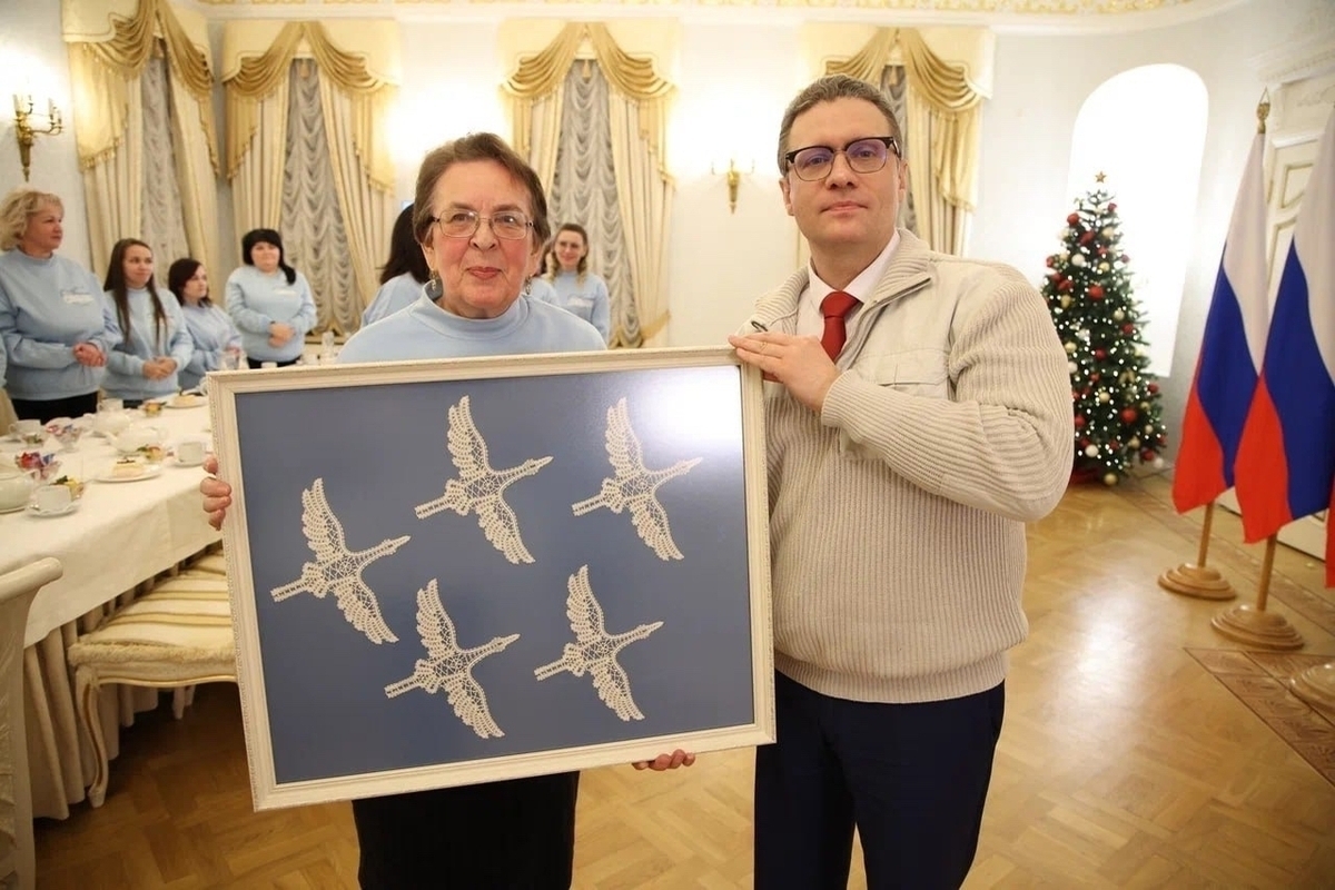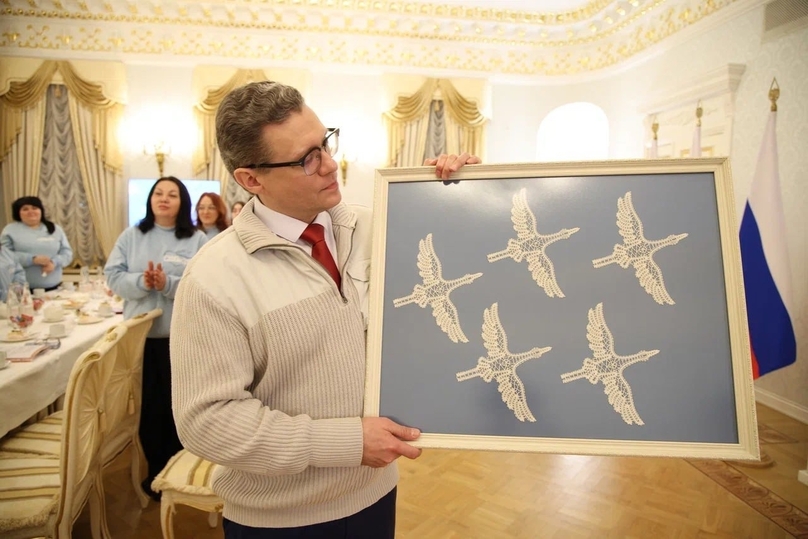 Панно с изображениями журавлей, выполненных в кружевной технике, получил в подарок глава Вологодчины Георгий Филимонов на встрече с семьями погибших бойцов СВО.
